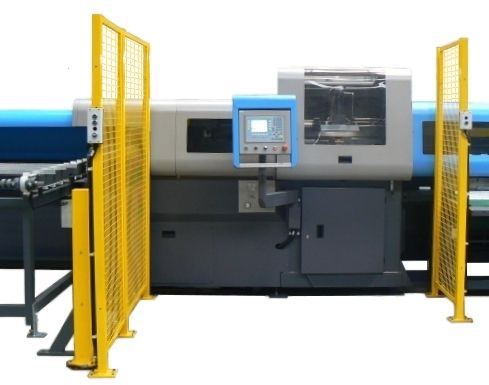 Przecinarka mogąca współpracować z automatycznym systemem załadowczym jak i odbiorczym z funkcją segregacji ciętych detali o danej długości do pojemników.